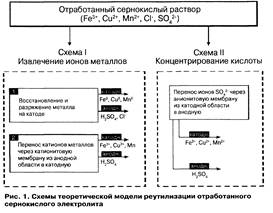 Существуют две схемы теоретической модели реутилизации отработанного сернокислого электролита (рис. 1). Схема I направлена на извлечение примесных металлов из отработанного раствора электролита, схема II — на концентрирование серной кислоты. Возможность реализации приведенных схем зависит от закономерностей поведения исследуемых катионов и анионов под действием постоянного тока в 18 — 34 %-ной серной кислоте.