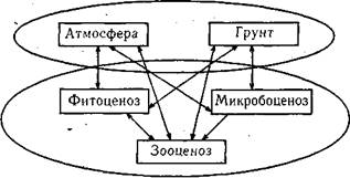 Компоненты биогеоценоза: биотоп и биоценоз (рис.1). Биотоп — однородное по адиатическим факторам среды пространство, занятое биоценозом, т. е. место жизни вида, организма.