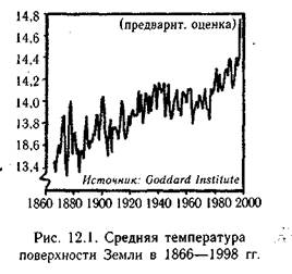 Возрастают также нагрузки на земную атмосферу. С расширением нашей глобальной экономики, основывающейся на использовании ископаемого топлива, выбросы углеродных соединений в атмосферу превысили способность природных систем связывать углекислый газ. В результате концентрация СО2 в атмосфере повысилась с примерно 280 млн. в начале промышленной эры до 363 млн. в 1998 г., что явилось рекордным уровнем за весь период наблюдений. По мнению ведущих ученых, концентрация СО2 и других парниковых газов стала причиной повышения температур в течение нынешнего столетия. Все 14 случаев, когда среднегодовая температура достигала наивысших значений за период с 1866 г., в котором впервые стали систематически регистрировать метеонаблюдения, имели место после 1980 г. (рис. 2)