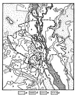 Ландшафти території Києва та їхня міська забудова: ландшафти змішано-лісового типу із піщаними та супіщаними деревно-підзолистими ґрунтами: 1 – підвищені моренно-водно-льодовикові хвилясті рівнини із дерновими середньо та слабко-підзолистими супіщаними ґрунтами під свіжими суборами й борами; 2 – знижені давньоалювіальні терасові дрібнохвилясті рівнини із дерновими слабко та середньо-підзолистими піщаними піщаними і супіщаними ґрунтами під сухими борами та свіжими суборами; ландшафти широколистяно-лісового типу підвищеної лесової акомулятивно-денудаційної горбисто-хвилястої рівнини із сірими лісовими ґрунтами; 3 – горбисто-хвилясті привододільні рівнини із темно-сірими та сірими легкосуглинковими ґрунтами, які сформувалися під свіжими дібровами: 4 – слабко-хвилясті рівнини із розлогими схиловими балками, із сірими й темно-сірими легкосуглинковими лісовими ґрунтами, що сформувалися під свіжими й вологими дібровами: 5 – розчленовані останцево-яружно-балочні схили рівнини із світло-сірими, сірими й дерновими легкосуглинковими й супіщаними ґрунтами, які сформувалися під свіжими дібровами й різнотравно-злаковою рослинністю; ландшафти знижених алювіальних терасових рівнин із дерновими, лучними й болотними ґрунтами; 6 – знижені алювіальні слабкохвилясті рівнини (висока заплава) із дерновими й лучними піщаними й супіщаними ґрунтами, які сформувалися під заплавними луками та вологими дібровами; 7 – низькозаплавні слабкостічні заболочені зниження із лучно-болотними, болотними, торфово-болотними ґрунтами й торфовищами, які сформувалися під вологими луками й болотною рослинністю; лісова рослинність зеленої зони Києва
