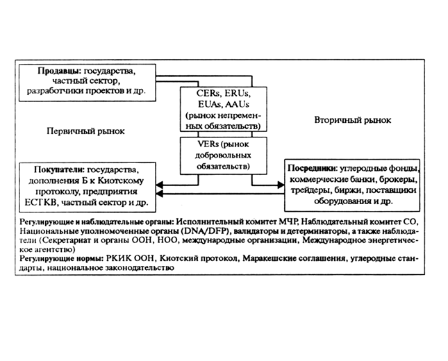 Рис. 2. Схема институциональной базы рынка прав на вредные выбросы парниковых газов и перемещений углеродного актива