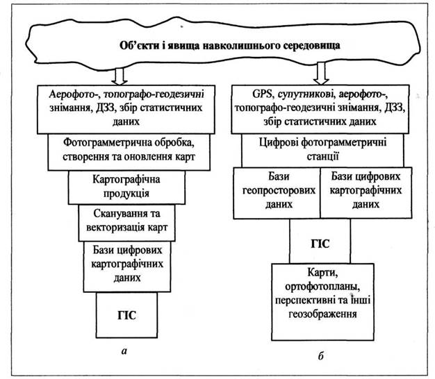 Мал. 2. Технології збору й обробки геопросторових даних при картографічному (а) та інформаційному (б) підходах.