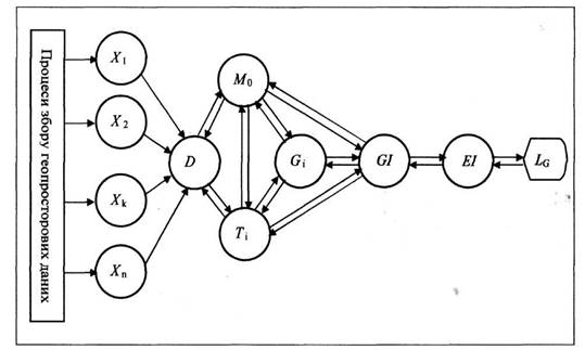 де: X - множина вхідних даних одержаних в процесі топографо-геодезичних знімань, GPS вимірювань, ДЗЗ тощо; D - база упорядкованих вхідних даних в уніфікованих форматах; Мо - модель базового набору геопросторових даних; Т - множина тематичних моделей геопросторових даних; G - множина моделей даних за спеціальними просторовими (геометричними) схемами, в тому числі тривимірні (3D) цифрові моделі рельєфу та місцевості; GI - цифрові моделі карт та інших геозображень; ЕІ - цифрові моделі електронних геозображень; Fij :Mi→Mj - функції перетворення моделі Мі вмодель Mj, в томучислі: Fxd :Xi → D - перетворення первинних даних в уніфіковані формати, Fdm : D → Mо - створення (оновлення) моделі базового набору геопросторових даних на основі первинних; Fdm :D → Ті - створення тематичних моделей геопросторових даних на основі первинних, а також аналогічні прямі й зворотні перетворення для усіх інших моделей (в напрямку стрілок між моделями на мал. 3); L - множина формальних мов та інтерфейсів взаємодії процесів, у тому числі мова LG дляподання електронних геозображень користувачам системи та інтерактивного доступу користувачів до гепросторових даних і програм їх обробки.