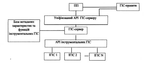 Незважаючи на різноманіття функціональних можливостей та механізмів інтеграції відкритих ГІС, проблема забезпечення незалежності прикладних програм від конкретних ГІС-платформ і форматів геоданих залишається актуальною. Одним із шляхів її подолання є введення в архітектуру застосувань додаткового елементу - уніфікованого ГІС-серверу застосувань (далі ГІС-сервер) як логічного програмного процесу, що слугує посередником між прикладною програмою-клієнтом (1Ш) та інструментальними ГІС конкретних виробників (ІГІС). Мова йде про використання трирівневої архітектури ГІС: застосування, ГІС-сервер застосувань, ІГІС як сервери геоданих (див. рисунок). Для взаємодії між окремими рівнями та елементами такої архітектури можуть бути використані відповідні інтерфейси прикладного програмування (АРІ) та різноманітні механізми інтеграції застосувань. Ключовими питаннями є уніфікація (в ідеалі - стандартизація) функцій ГІС-серверу та потенційна можливість його параметризації з метою спрощення налагодження на характеристики конкретних інструментальних ГІС.