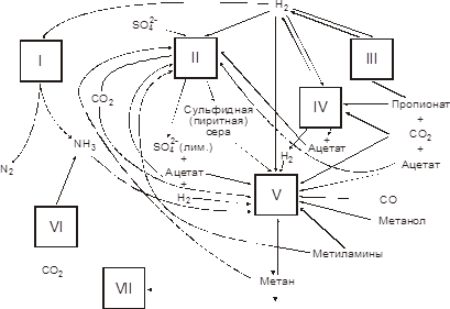 Бактерии, потребляющие: I – нитраты, II – сульфаты; бактерии, образующие: III – пропионат, IV – ацетат, V – метан; бактерии, катаболирующие: VI – аминокислоты, VII – метилированные металлоорганические комплексы.