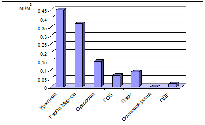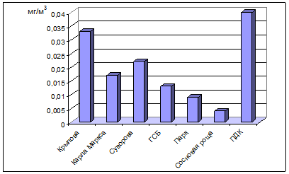 | ул. Суворова | 0,15±0,021 | 0,019±0,0022 | 1,7±0,25 | 0,049±0,0053 | 0,69±0,072 |