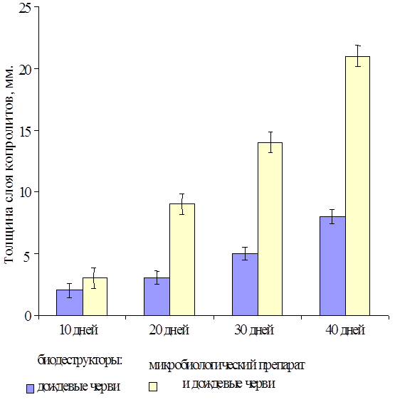 Проведенные исследования показали, что комплекс биодеструкторов, состоящий из представителей двух трофических уровней - ассоциации нефтеразрушающих микроорганизмов - "Дестройл" и дождевых червей, более эффективно элиминировал нефть из нефтезагрязненных почв и снижал фитотоксичность исследуемых образцов, чем в случае их раздельного внесения.