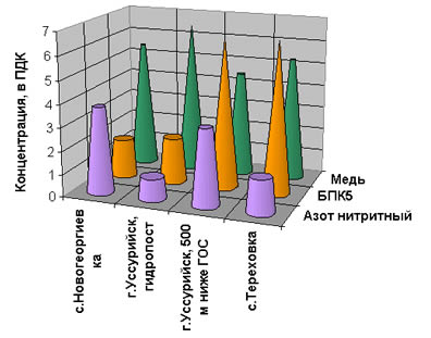 Наибольшее беспокойство в экологическом состоянии водных объектов в районе г. Уссурийск вызывает загрязнение рек легкоокисляемыми органическими веществами (по БПК5 – биохимическое потребление растворенного в воде кислорода за 5 суток). Среднегодовая концентрация легкоокисляемых органических веществ превысила санитарную норму для рыбохозяйственных водоемов в 5-6 раз и достигла уровня высокого загрязнения. В такой воде быстро размножаются различные грибы и патогенные бактерии, что приводит к изменению структуры животного сообщества и к уменьшению содержания растворенного в воде кислорода, который расходуется на окисление органических веществ.