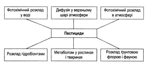 Загальну схему перетворення пестицидів у навколишньому середовищі можна показати так як зображено на Рис. 1.