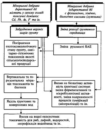 • директивної (прямої) дії – негативний вплив на природне середовище спричинений токсичними домішками мінеральних добрив, серед яких найнебезпечнішими є ВМ, галогени, радіонукліди тощо, які і є безпосередніми забруднювачами.