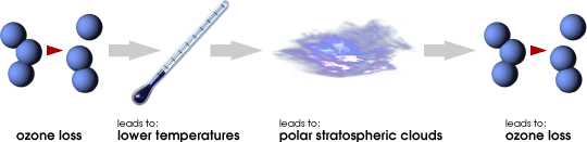 истощение озона - ведёт к снижению температуры – ведёт к полярным стратосферным облакам – ведёт к истощению озона