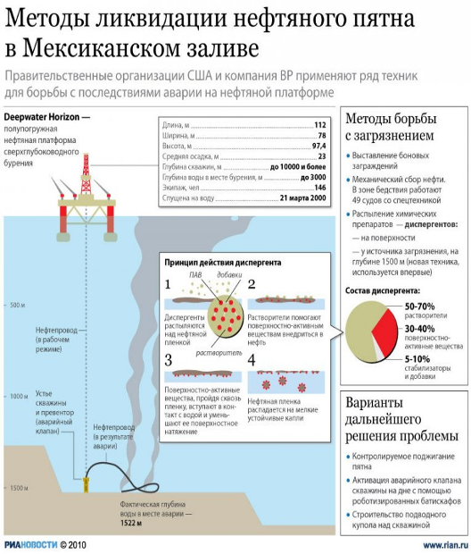 Управляемая компанией BP нефтяная платформа в Мексиканском заливе затонула 22 апреля после 36-часового пожара, последовавшего вслед за мощным взрывом. Нефть на этой платформе добывалась с рекордной глубины в 1,5 тысячи метров. Сейчас нефтяное пятно достигло побережья штата Луизиана и приближается к берегам двух других штатов США – Флориды и Алабамы. Специалисты опасаются, что пострадают животные и птицы национального заповедника в Луизиане и окрестных национальных парках. Под угрозой биологические ресурсы залива.