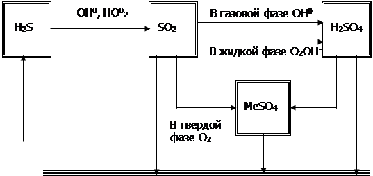 В атмосфере соединения серы претерпевают целый ряд превращений (см рисунок ниже). Сероводород последовательно, в ряд ступеней, окисляется до диоксида серы, который, в свою очередь, тоже окисляется до серного ангидрида в результате фотохимического и радикального механизмов его взаимодействия с компонентами атмосферы, причем эти процессы существенно ускоряются в присутствии оксидов азота или углеводородов, а также оксидов железа, алюминия, хрома и других металлов. Атмосферная влага тоже способствует окислению диоксида в триоксид: в дождливую или туманную погоду время существования атмосферного диоксида серы не превышает 50 - 60 мин.