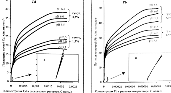 Адсорбция тяжелых металлов почвами сопровождается значительным уменьшением значений рН равновесных растворов. Так по мере заполнения почвенно-поглощающего комплекса катионами тяжелых металлов значения рН равновесных растворов уменьшается вследствие вытеснения ионов водорода из слабокислотных основных обменных позиций и, частично, гидролиза катионов ТМ в растворе. Значения максимальный адсорбций катионов ТМ почвами может быть меньше, равно или больше стандартных значений емкости катионного обмена. В присутствии в ППК обменных катионов со слабокислотными и основными функциями, имеющих высокое относительное сродство к ионам водорода, не позволяет получать монотонные формы почвы путем их обработки концентрированными растворами нейтральных солей.