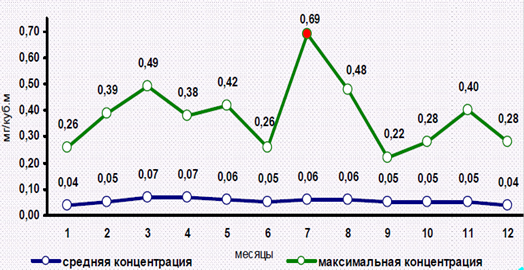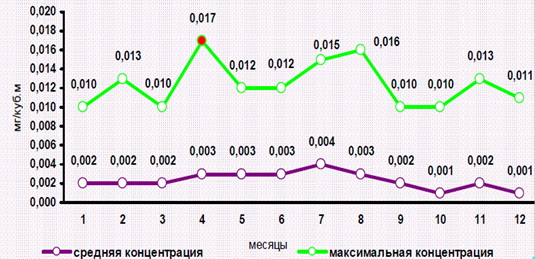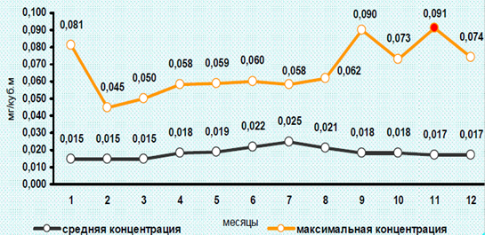 По фенолу наибольшая концентрация 0,017 мг/м3 (1,7 ПДК) отмечалась на ПНЗ №6 (Ленинский район) 25 апреля при западном ветре со стороны автостоянки и СТО (станции техобслуживания автомобилей).