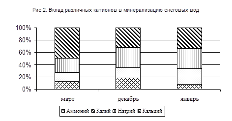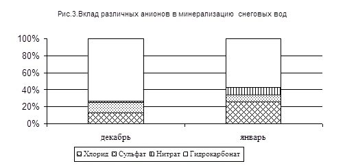 Как видно из представленных данных, в атмосферных осадках зимнего периода изучаемого урбанизированного региона среди анионов наблюдается преобладание гидрокарбонат-ионов – от 73,5 до 57,5% (при сравнении снеговых вод декабря и января). Содержание SO4 2 – уменьшилось с 12 до 8% (в 0,5 раза), а Cl- иSO4 2 – увеличилось с 12,5 до 25,5% (2) и с 2,0 до 9,0% (4,5) соответственно.