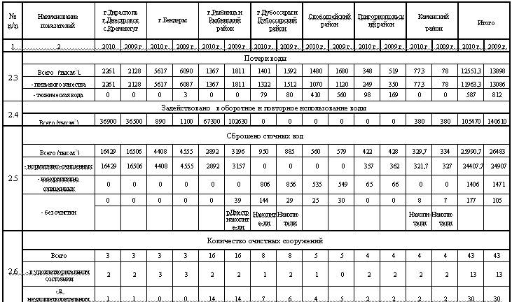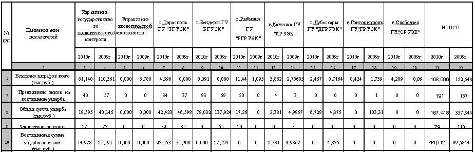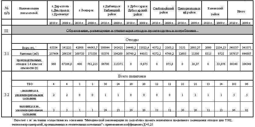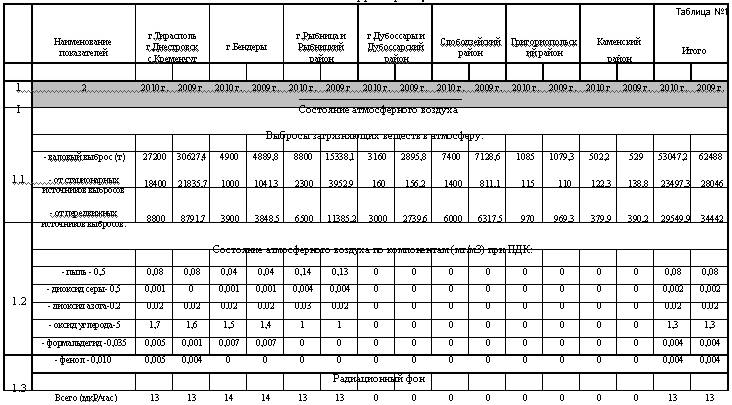 Таблица 1.Экологическая ситуация в ПМР за 2010 год в сравнении с 2009 годом в разрезе административных территорий