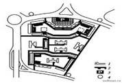 Рисунок 1.Пример транспортного обслуживания микрорайона (район Строгино, Моспроект-1):1 – улицы и дороги; 2 – Внутримикрорайонные проезды; 3 – автостоянка; 4 – остановка общественного транспорта
