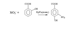 Метод определения нитратов основан на способности салициловой кислоты в присутствии H2 SO4 (конц). вступать в реакцию нитрования с образованием нитросалициловой кислоты, которая в щелочной среде образует окрашенную в желтый цвет соль.
