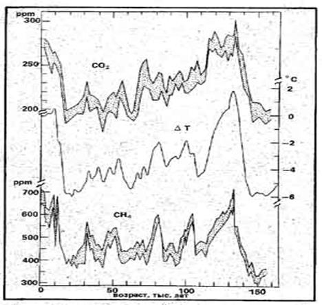 Также прослежена эволюция содержания углекислого газа в геологические эпохи: накопление СО2 в межледниковые периоды, интенсивное извлечение из атмосферы, минимальное содержание и наступление оледенений, замедление захоронения СО 2 и снова накопление. Интересно, что по данным ледниковых кернов, при переходе от ледниковой эпохи к межледниковью содержание СО2 и температура меняются синхронно, то при обратном переходе концентрация углекислого газа уменьшается позднее, чем снижается температура. Эта альтернативная точка зрения может стать научной базой для решения данной проблемы.