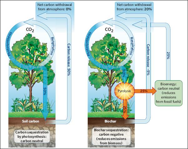 Экологи ищут простые способы связывания углерода атмосферы и по возможности долгого удержания его в форме, которая бы за счет природных процессов не превращалась снова в CO2 . Выращивание лесов и вообще восстановление естественного растительного покрова, безусловно, способствует изъятию углекислого газа из атмосферы и накоплению углерода в тканях растений и в органическом веществе почвы. Однако как только леса и другие растительные сообщества достигают своей зрелости, поглощение CO2 в ходе фотосинтеза уравновешивается выделением этого газа в результате дыхания — как самих растений, так и, главное, организмов-редуцентов (грибов и бактерий), осуществляющих разложение отмерших растительных остатков. Соответственно, чтобы препятствовать возврату CO2 в атмосферу, необходимо сделать углерод органического вещества недоступным для редуцентов.Образовавшееся органическое вещество растений подвергают нагреванию в условиях дефицита кислорода (процессу пиролиза) и получают древесный уголь. Содержание углерода в древесном угле примерно в два раза выше, чем непосредственно в массе растительных остатков, но бактерии и грибы не могут использовать его для своих нужд. Поэтому, будучи внесенным в почву, древесный уголь может там сохраняться довольно долго — столетия, а возможно, и тысячелетия (по крайней мере, такого возраста естественно образовавшийся древесный уголь известен).