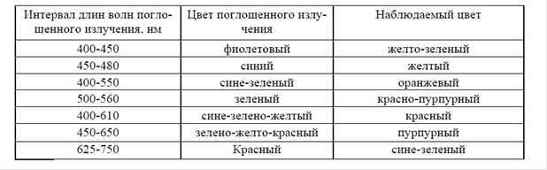Если спектральные характеристики окрашенного вещества неизвестны, светофильтр для работы можно выбрать самостоятельно. В видимой части спектра воспринимаемый цвет есть результат избирательного поглощения определенного участка спектра белого света. Цвет раствора является дополнительным к цвету поглощения излучения. Поэтому измерение поглощения следует проводить в дополнительной для цветной реакции области спектра. Так, если раствор окрашен в сине-зеленый цвет, то нужно измерять поглощение этим раствором красного цвета.