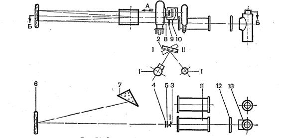 1 — источник света; 2 — зеркальный конденсор; 3 — плоское зеркало; 4 — линза б — щель; б — зеркальный объектив; 7 — диспергирующая линза; 8 — выходная щель; 9 — кварцевая линза; 10 — фильтр; 11 эталон; 12 — защитная пластинка; 13 — фотоэлемент.