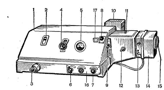 1 — корпус; 2 шкала; 3 — маховик; 4 — рукоятка; 5 индикаторный миллиамперметр; б переключатель; 7 — регулятор чувствительности; а — регулятор щели; 9 — блок сменных электрофильтров; 10 — осветитель; 11 — отделения для кювет; 12 рукоятка для смены кювет; 13 — переключатель фотоэлементов; 14 — камера для фотоэлементов; ‘5 — патрон; 16 — панель; 17 — шкала.