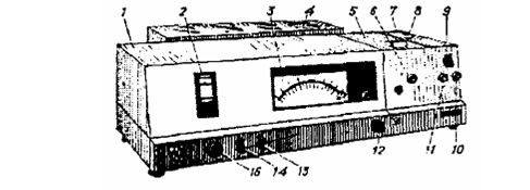 1 - монохроматор; 2 - шкала длин волн; 3 - измерительный прибор; 4 - осветитель с источником излучения и стабилизатором; 5 - кюветное отделение; 6 - рукоятка перемещения каретки с кюветами; 7 - камера с фотоприемниками и усилителем; 8 -рукоятка переключения фотоэлементов; 9 - рукоятка установки чувствительности; 10 - рукоятка установки на «0»; 11 - рукоятка шторки; 12 - рукоятка регулировки ширины щели; 13 - рукоятка «Отсчет»; 14 - рукоятка компенсации; 15 – рукоятка шкалы длин волн.