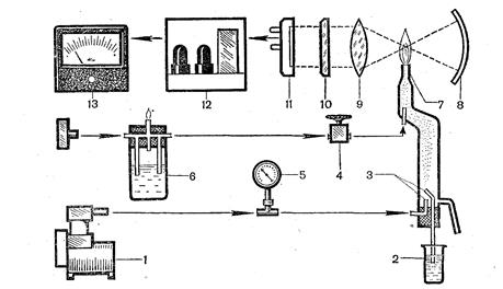 При фотометрии пламени анализируемый раствор сжатым воздухом или кислородом в виде аэрозоля вводят в пламя газовой горелки. При наличии в растворе ионов легковозбуждаемых элементов пламя окрашивается вследствие характерных излучений, которые фиксируются фотоэлементом. Возникающий фототок измеряется чувствительным гальванометром.