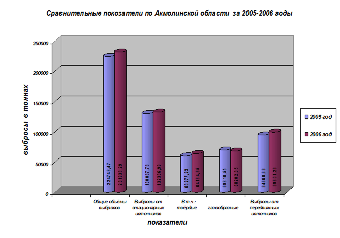 Основными источниками выбросов загрязняющих веществ в Акмолинской области являются автотранспорт и предприятия теплоэнергетики. Как и в прежние годы, крупнейшими стационарными источниками загрязнения атмосферы Акмолинской области являются Степногорская ТЭЦ ТОО «Джет-7» и ГКП «Районная котельная №2» г.Кокшетау. Сравнительные данные за 4-ый квартал 2006 года в соотношении с аналогичными периодами 2005 года (в тоннах) представлены в таблице 1. (приложение 3)
