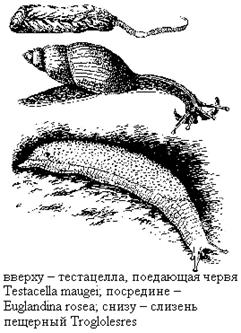 Не лишены хищности и типичные слизни, для которых характерна рудиментарная раковина, скрытая в коже. Так, хищниками являются все виды слизней из семейства тригонохламид (Tri-gonochlamididae), распространенного у нас на Кавказе. Они в "погоне" за своими жертвами - почвенными червями-уходят довольно глубоко в землю.