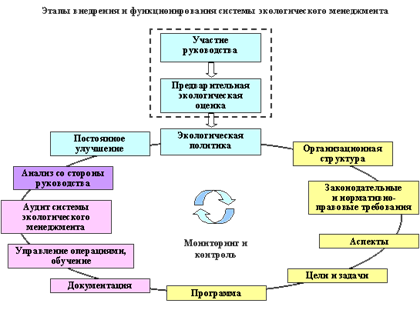 Система экологического менеджмента представляет собой modus operandi для промышленности, необходимый для достижения целей экологической политики и поэтапного решения конкретных задач. Существует четкая параллель между требованиями к организации системы "всеобъемлющего менеджмента качества" TQM (Total Quality Management) и системы экологического менеджмента EMS. Отметим, что ядром философии менеджмента в развитых странах считается всеобъемлющая система качества (ТQM), которая нацелена на эффективном получении качественной продукции и услуг (через весь жизненный цикл - от сырья через производство к жизни самой продукции и окончательному размещению отходов).
