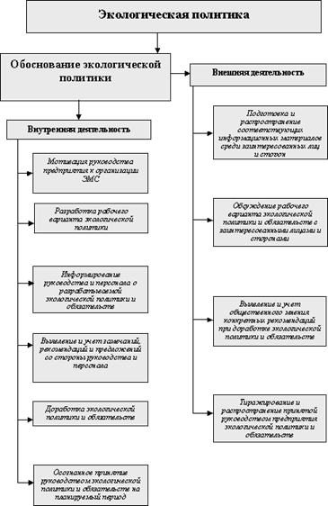 Экологическая политика должна рассматриваться как первичный двигатель процесса внедрения и развития, улучшения системы экологического менеджмента в организации, которая нацелена на улучшение экологических показателей деятельности организации. Поэтому экологическая политика должна отражать приверженность высшего руководства, его обязательства в отношении соответствия требованиям законодательных, нормативно-технических и других требований, а также принципу последовательного улучшения