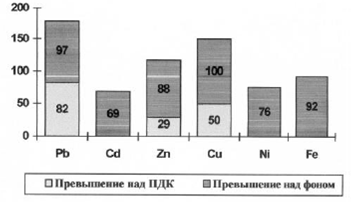 Особенно сильно загрязнены металлами придорожные пространства, где наблюдается превышение по свинцу: ПДК – в 6-7 раз, в 26 раз фонового уровня – что отмечается и для подвижных, и для валовых форм. По цинку это превышение составляет: 2-3 раза – ПДК, 14 раз – фон. Отмечено загрязнение придорожных пространств медью в результате истирания контактных проводов трамваев и троллейбусов, а также выбросов автотранспорта.