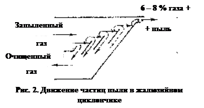 Небольшая часть воздуха вместе с концентрированной пылью отводится из отверстия наименьшего кольца в вершине конуса и поступает в циклончик, рассчитанный на 5 – 7 % от общего расхода установки (рис. 3).