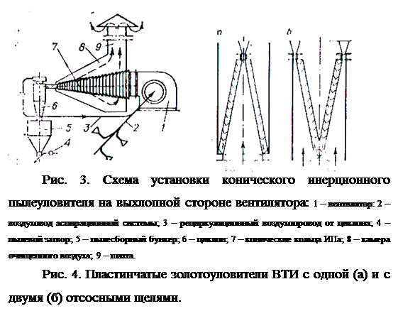 Конические инерционные пылеуловители (ИПы) собраны из большого числа конических колец, закрепленных в каркасе с просветами между кольцами 4,2 мм. Скорость выхода воздуха в первое, самое большое кольцо принимается 15 – 25 м/с.