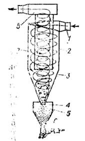 В этих циклонах (рис. 5) воздух входит в циклон через тангенциальный патрубок 1, и, приобретая вращательное движение, опускается винтообразно вдоль внутренних стенок цилиндра 2 и конуса 3.
