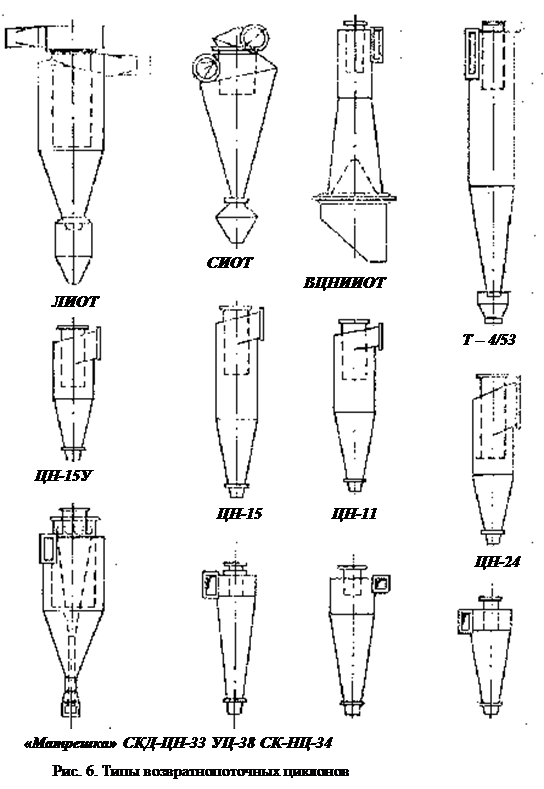В отечественной пылеочистной технике применяются различные типы циклонов одного назначения (рис. 6). Причиной такого чрезмерного разнообразия является то обстоятельство, что разработкой этих устройств на протяжении десятилетии занималось множество организаций, не координировавших свою деятельность.
