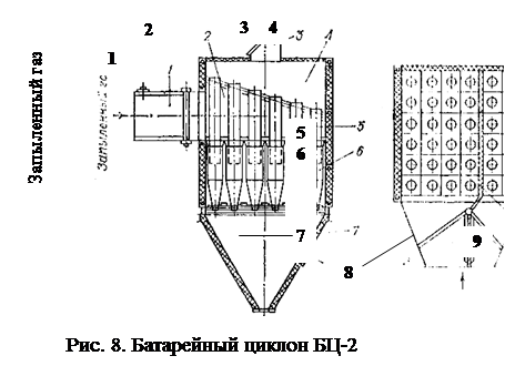 Сочетание центробежный и инерционных процессов, на основе которых работает пылеуловитель (рис. 21), позволяет значительно повысить степень улавливания мелкодисперсных частиц из газового потока за счет снижения вторичного уноса пыли.