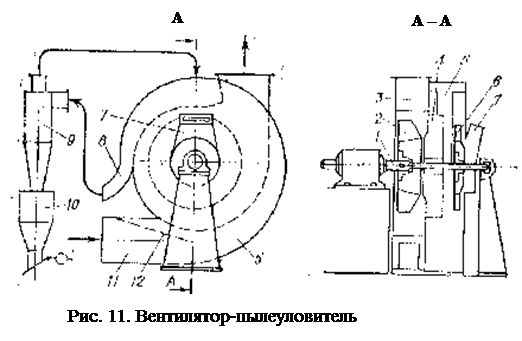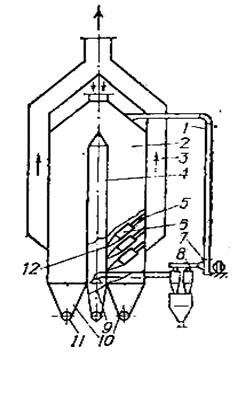 Между входным патрубком 8 второго пылеулавливающего аппарата 6 и входным патрубком 2 первого пылеулавливающего аппарата располагается основное тягодутьевое устройство 12 (вентилятор или дымосос).