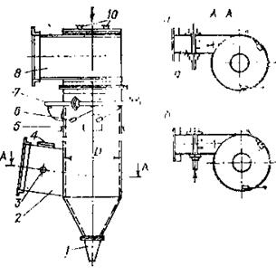 от пыли, двигается по направлению снизу вверх и удаляется через коаксиально расположенную выхлопную трубу 7 и улитку 8 из циклона. Небольшая часть этого потока, в котором сконцентрирована основная масса выделяющейся пыли, поступает через пылеотводящее отверстие 4 в бункер 5, где происходит окончательное осаждение частиц. Эта часть потока, освободившись от сконцентрированных в нем частиц, выходит из бункера через центральную зону того же пылеотводящего отверстия 4. Уловленная пыль выгружается из бункера 5 через пылеспускной патрубок и разгрузочное устройство 6, которое в период работы циклона должно обеспечивать полную герметичность.