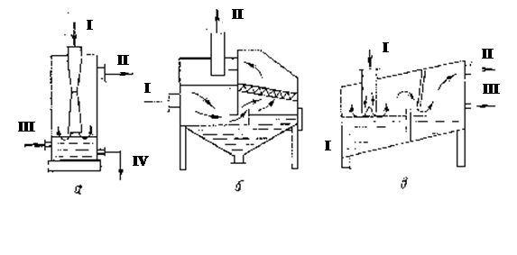 Рис. 15. Аппараты ударно-инерционного типа: а – ударно-инерционый пылеуловитель; б – пылеуловитель ПВМ; в – скрубберДойля; I –запыленный газ; II – очищенный газ; III – вода; IV – шлам.