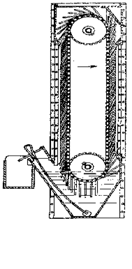 Самоочищающиеся масляные фильтры состоят из непрерывно движущейся фильтрующей панели и масляной ванны. При прохождении через ванну панель отмывается от пыли и, которая постепенно оседает на дно ванны. Для заполнения ванны применяют веретенное, вазелиновое или парфюмерное масло. Эффективность очистки воздуха достигает 90 – 98 %. На рис. 17 показана движущаяся панель фильтра шторчатого типа, который состоит из плотно перекрывающих друг друга металлических звеньев-шторок, подвешенных к двум непрерывным цепям и покрытых маслом. Запыленный воздух, проходя через них, оставляет на их поверхности частицы пыли [3].