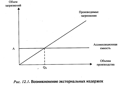 Однако при увеличении объемов производства свыше Qa и соответственно росте загрязнений более количества А, свыше ассимиляционной емкости среды возникают экстернальные издержки, налагаемые на общество.