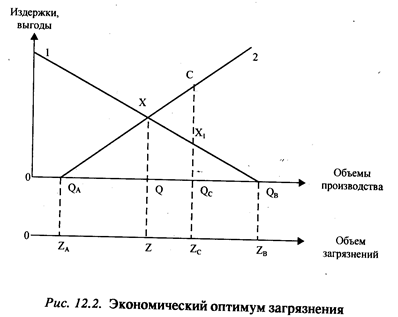 Экономический оптимум загрязнений достигается в точке X, где пересекаются кривые 1 и 2. В этой точке предельная чистая прибыль производителя равна предельным экстернальным издержкам. При этом уровень производства равен Q, а уровень загрязнений — Z.
