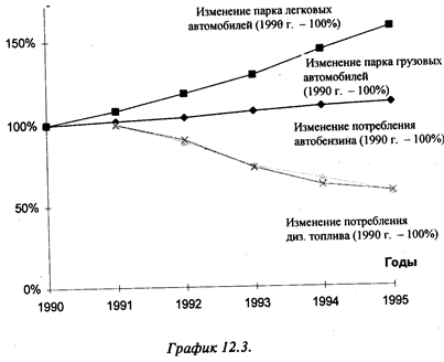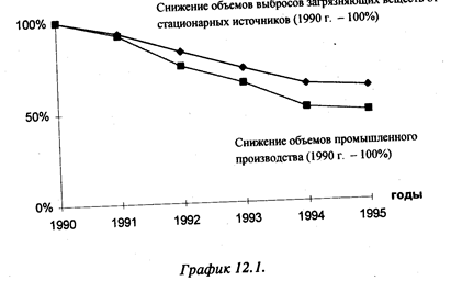 Загрязнение атмосферы химическими веществами — наиболее существенный фактор общего загрязнения. Как уже говорилось, его источниками могут быть как стационарные установки, так и транспортные средства. Всего от стационарных источников в РФ (как правило, это предприятия) в последнее время выбрасывается более 20 млн т загрязняющих веществ в год, 80% которых находятся в газообразной или жидкой форме. Это — чистый выброс, получающийся после улавливания большей части загрязнителей. Показатель улавливания достаточно высок, он составляет около 75 % от общего количества отходящих загрязняющих элементов. Иными словами, если бы технологий улавливания не существовало бы, ежегодный выброс химических веществ .достиг бы размеров примерно в 100 млн т. Нужно сказать, что объем 'выбросов от стационарных источников в последние годы уменьшается ; (в 1990 г. было выброшено 34 млн т), что в первую очередь является 'следствием падения объемов производства, а не решающих успехов в деле охраны окружающей среды. Однако, как следует из графика1., производство сократилось в большей степени, чем выбросы. Это подтверждает тезис о том, что бороться с загрязнением методами простого закрытия предприятий или сворачивания отдельных отраслей малоэффективно. Без структурной перестройки, изменения технологий оставшиеся предприятия могут даже увеличить выбросы в масштабах страны как абсолютно, так и относительно за счет старения основных средств, в том числе и экологического назначения.