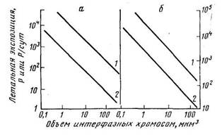 Зависимость радиочувствительности древесных (а) и травянистых (б) растений от объема интерфазных хромосом (по Спэрроу, 1965): 1—острое облучение (экспозиция в Р); 2 — хроническое об» лучение (экспозиция в Р/сут)