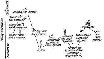 При остром облучении растений в различные периоды онтогенеза они реагируют по-разному в зависимости от этапа органогенеза в момент начала облучения (рис.). Радиация вызывает у растений поражение тех органов и смещение тех процессов, которые формируются и протекают в период воздействия. В зависимости от величины дозы облучения эти изменения могут носить либо стимулирующий, либо повреждающий характер.