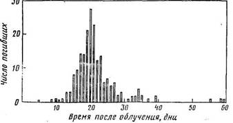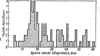 При однократном облучении сельскохозяйственных животных в дозах, вызывающих крайне тяжелую степень острой лучевой болезни (более 1000 Р), обычно они погибают в течение первой недели после радиационного воздействия. Во всех других случаях летальные исходы острой лучевой болезни наблюдаются чаще всего на протяжении 30 дней после облучения.1 ! Причем после однократного облучения большая часть животных погибает между 15-м и 28-м днями (рис.); при фракционированном облучении летальными дозами гибель животных происходит в течение двух месяцев после радиационного воздействия (рис.).